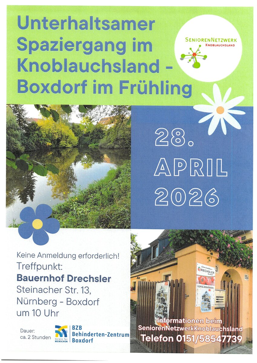 Außer der Reihe am Dienstag, 28.04.2026: Ein unterhaltsamer Spaziergang (für ALLE) durch Boxdorf lädt zum gemeinsamen Entdecken ein.